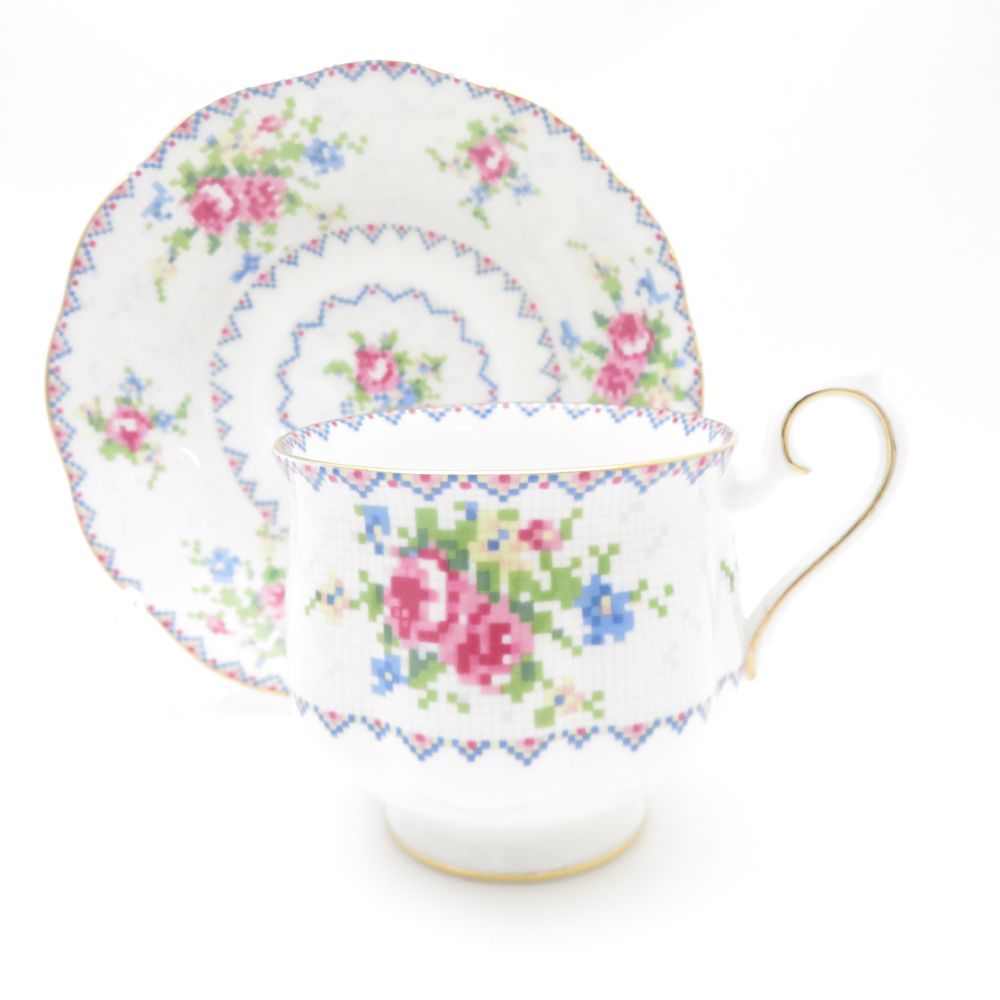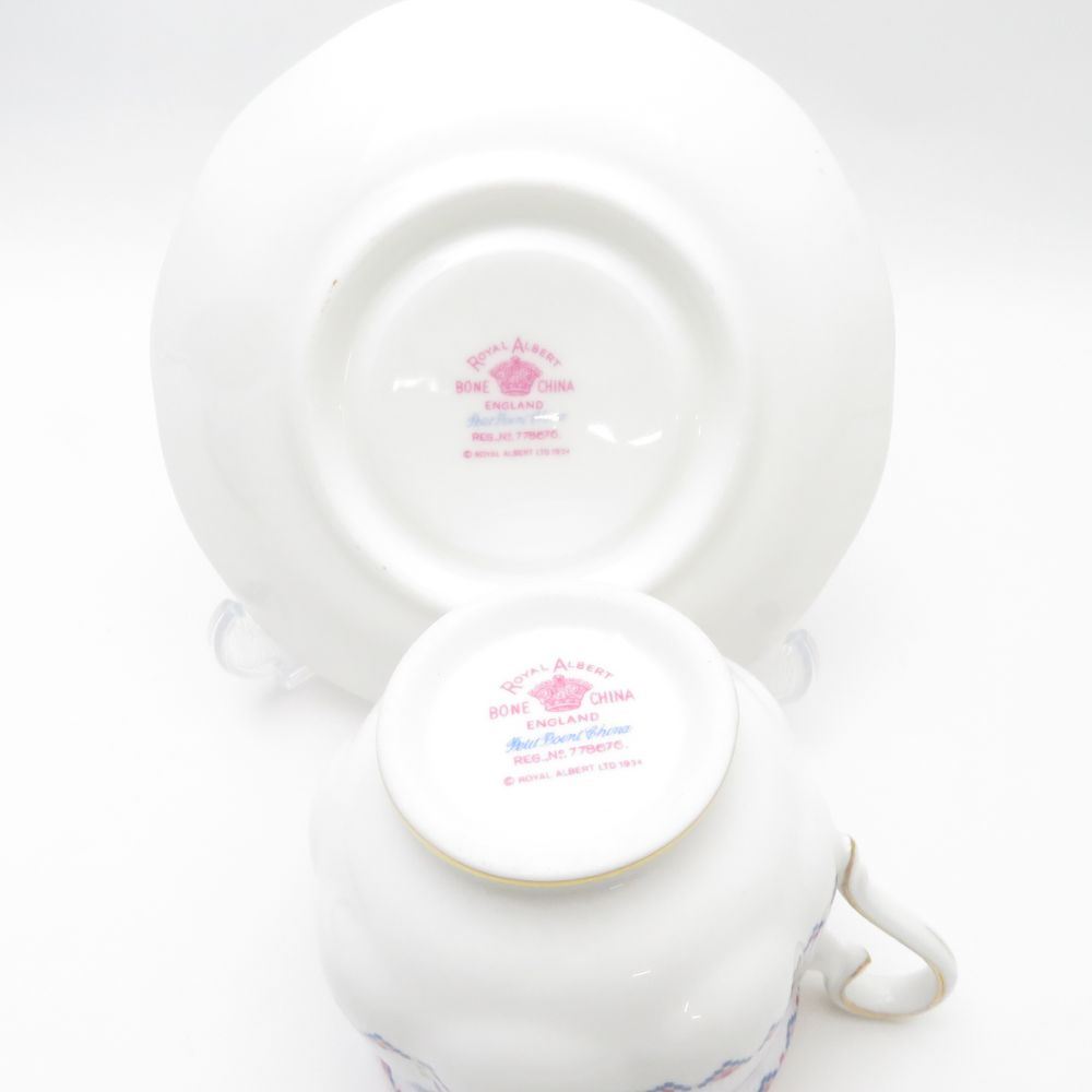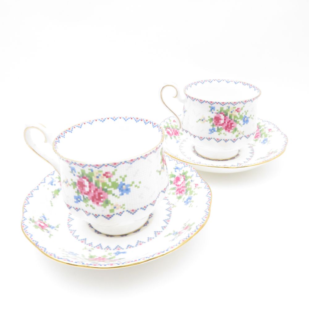 美品 ROYAL ALBERT ロイヤルアルバート PETIT POINT プチポワン ティーカップ&ソーサー 2客 ペア SY11256D1 【中古】