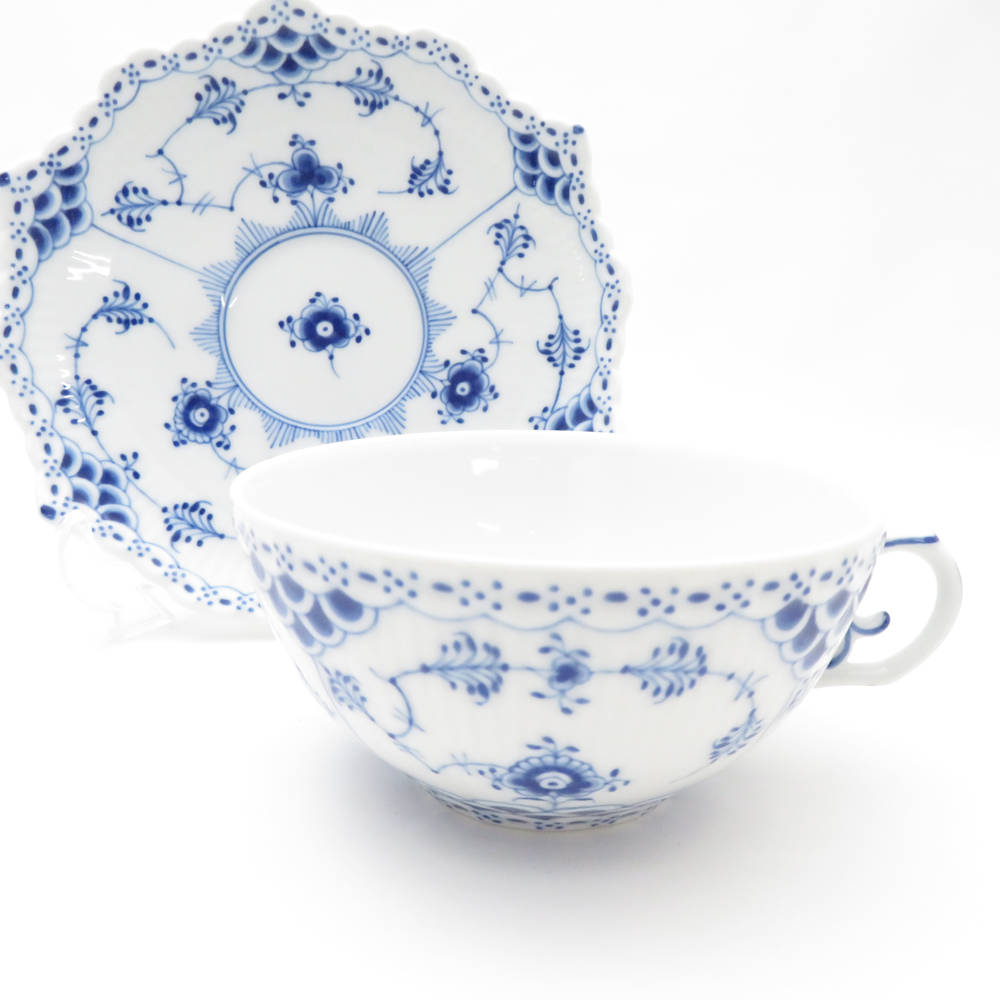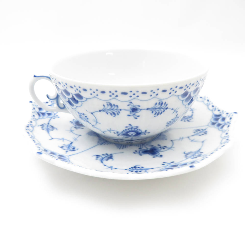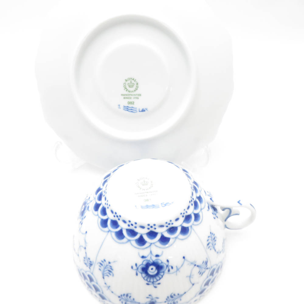 美品 ROYAL COPENHAGEN ロイヤルコペンハーゲン ブルーフルーテッドフルレース 081/082 ティーカップ&ソーサー 1客 白磁 青 高級食器 テーブルウェア SU12956B4 【中古】