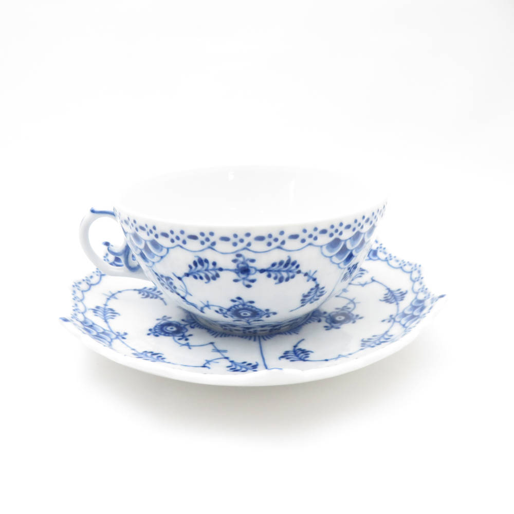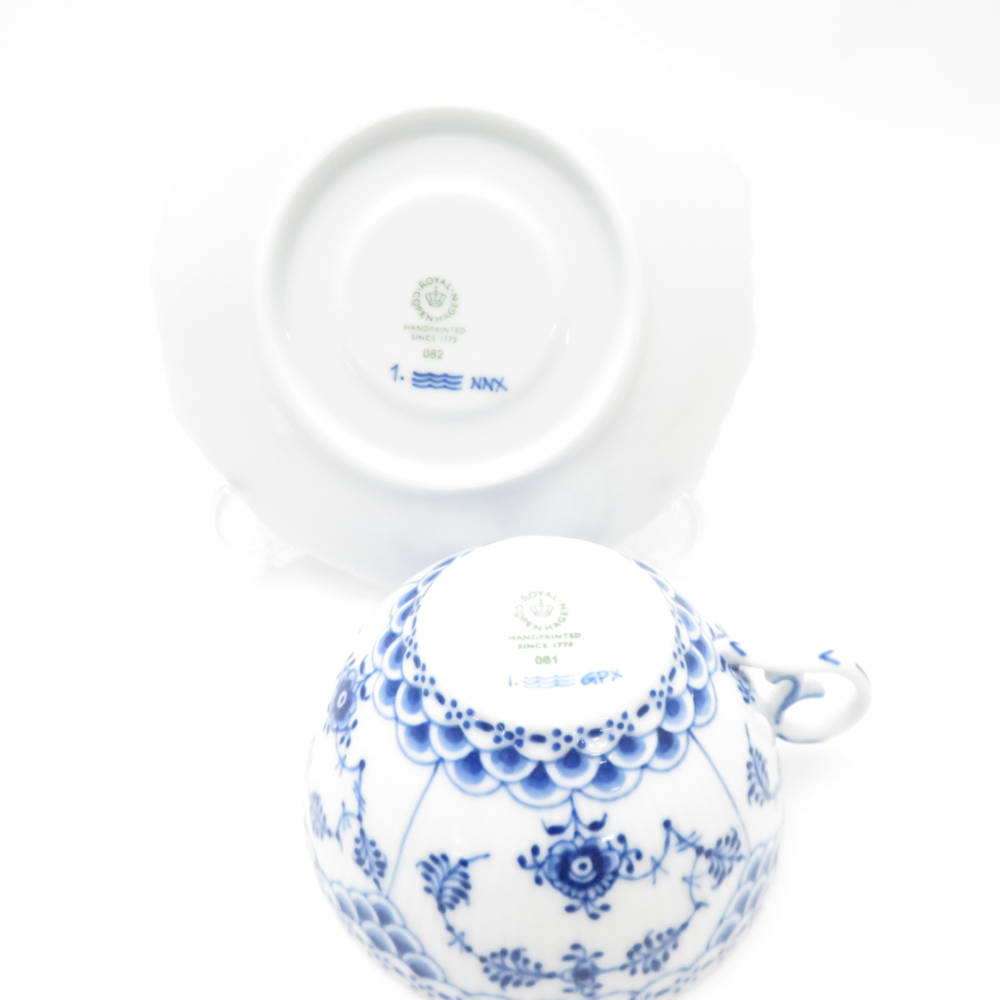 美品 ROYAL COPENHAGEN ロイヤルコペンハーゲン ブルーフルーテッドフルレース 081/082 ティーカップ&ソーサー 1客 白磁 青 高級食器 テーブルウェア SU12958B4 【中古】