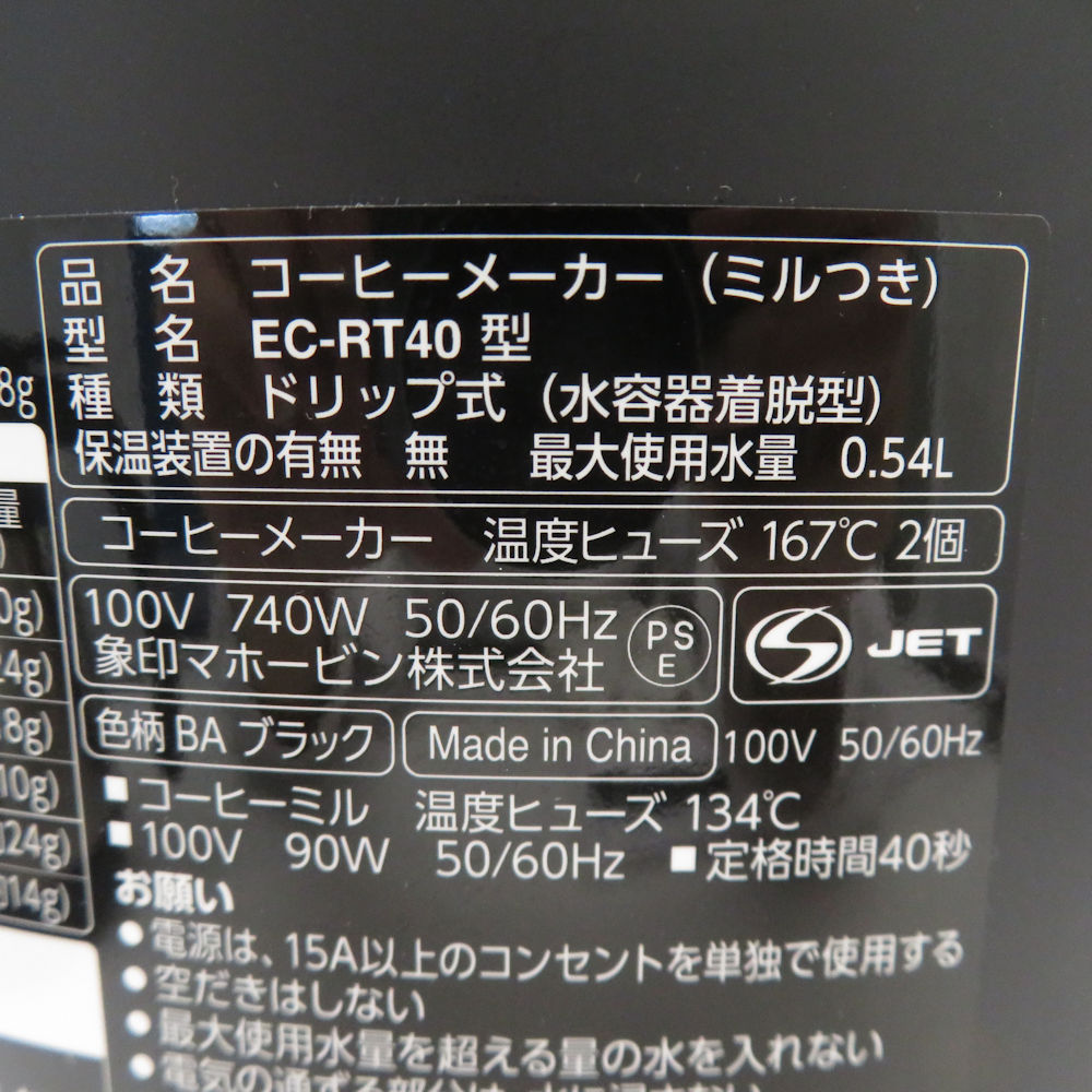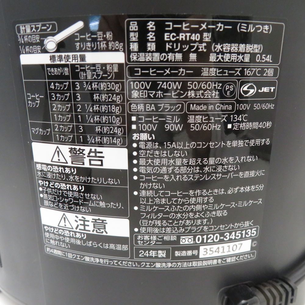 ZOJIRUSHI 象印 EC-RT40 珈琲通 全自動コーヒーメーカー 1点 2024年製 ミル付き 挽きたてドリップ 家電 SU13146Z 【中古】