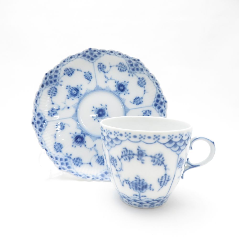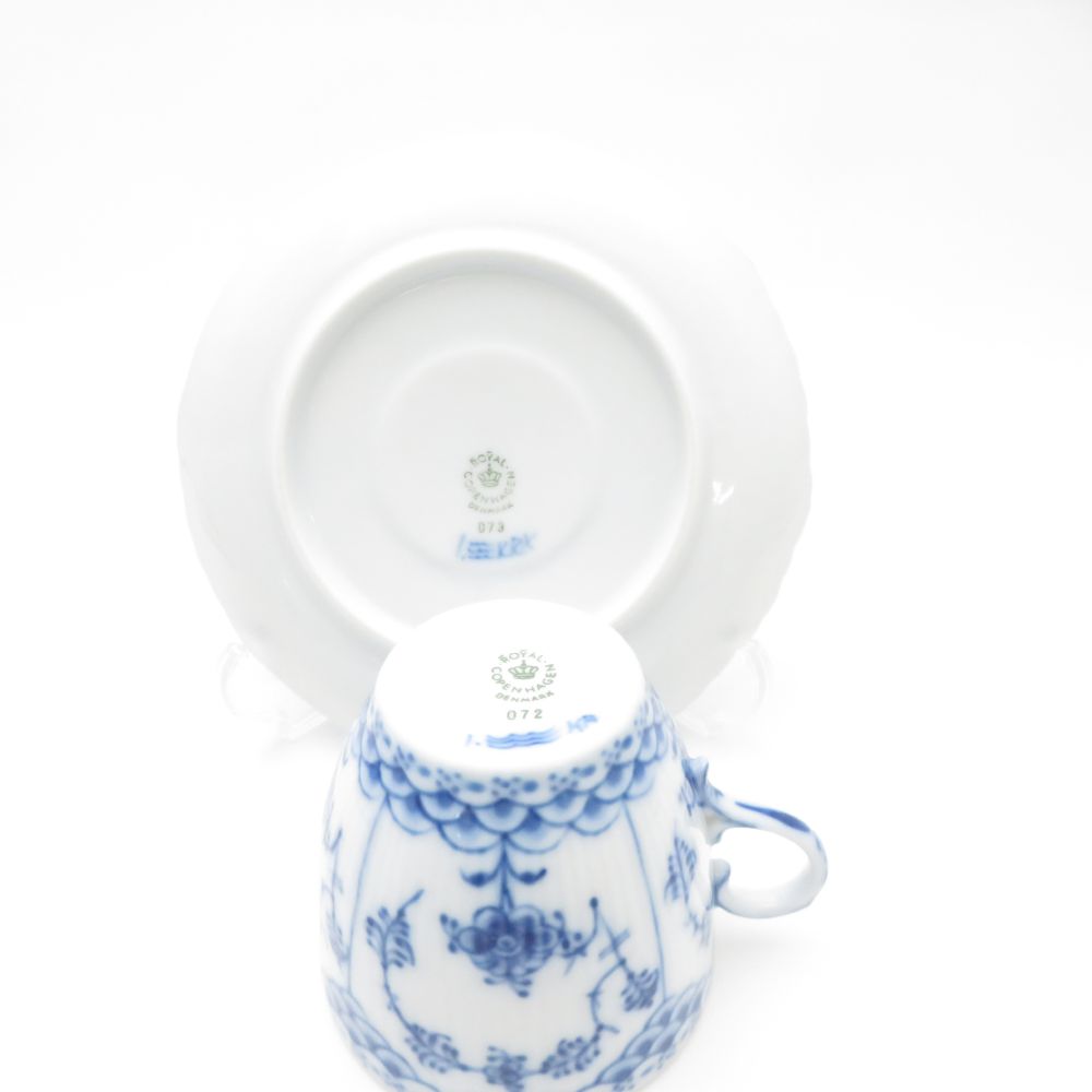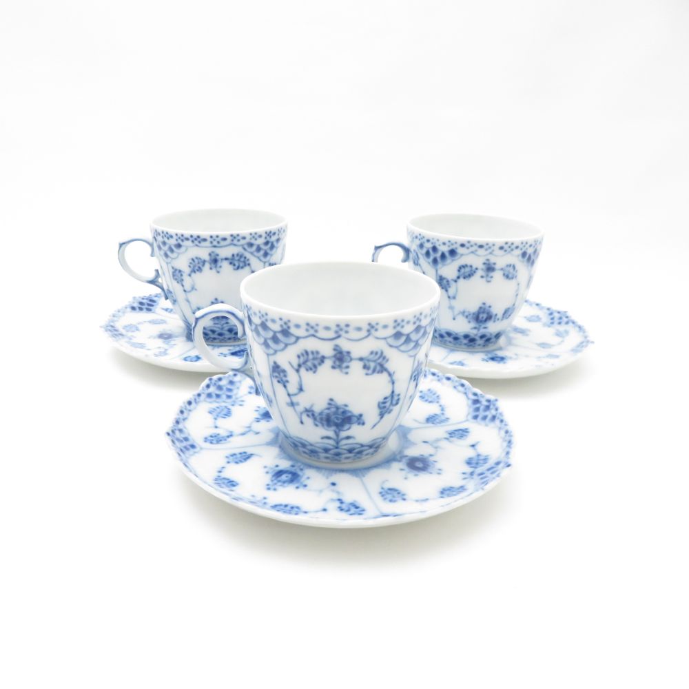 美品 ROYAL COPENHAGEN ロイヤルコペンハーゲン ブルーフルーテッドフルレース デミタスカップ&ソーサー 3客 セット エスプレッソ モカ テーブルウェア SU13169C2 【中古】