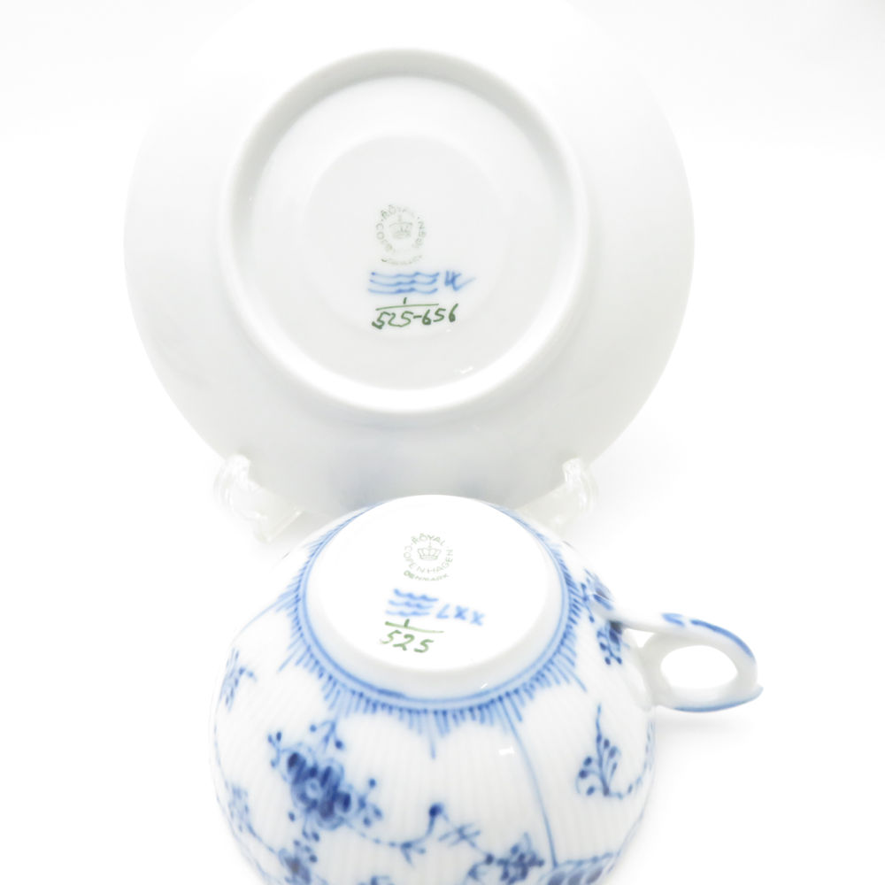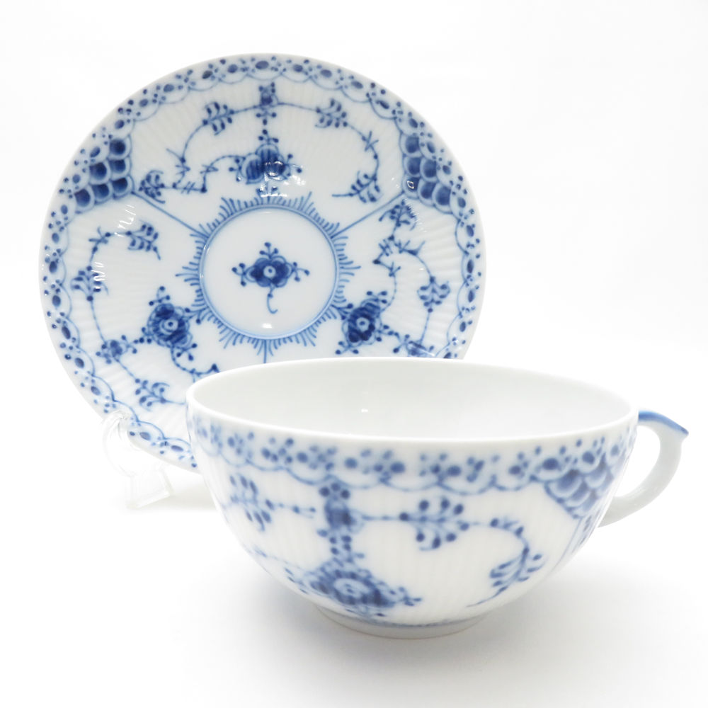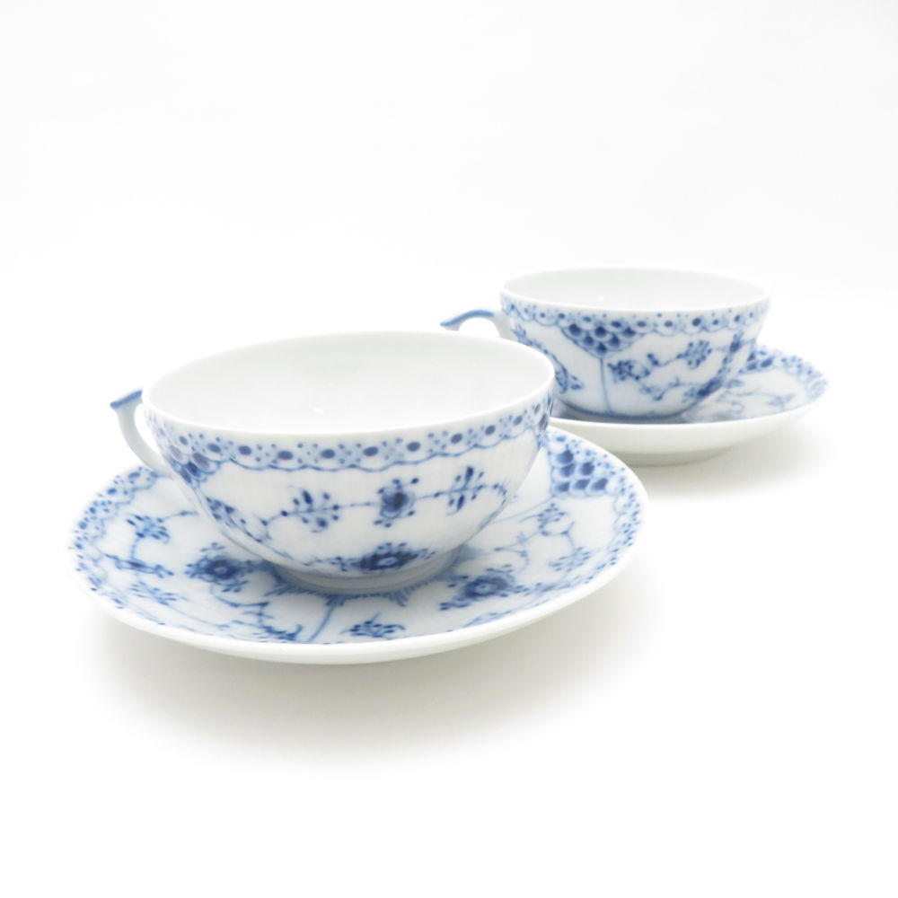 美品 ROYAL COPENHAGEN ロイヤルコペンハーゲン ブルーフルーテッドハーフレース ティーカップ&ソーサー 2客 ペア デンマーク製 SC8983K2 【中古】