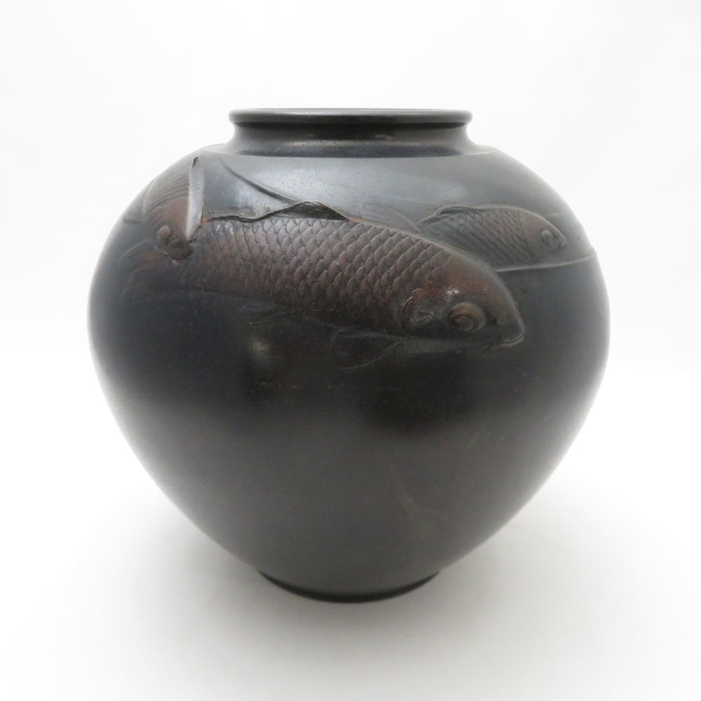勘渓工房 般若勘渓 唐銅群鯉地文 丸型花瓶 SM4794Z 【中古】
