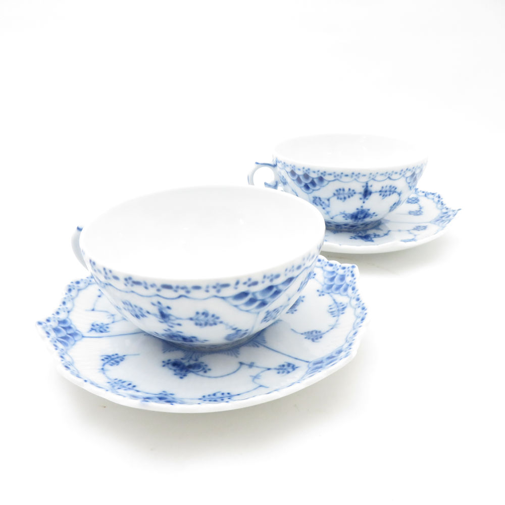 未使用 ROYAL COPENHAGEN ロイヤルコペンハーゲン ブルーフルーテッドフルレース ティーカップ&ソーサー 2客 ペア デンマーク製 SC9563E2 【中古】